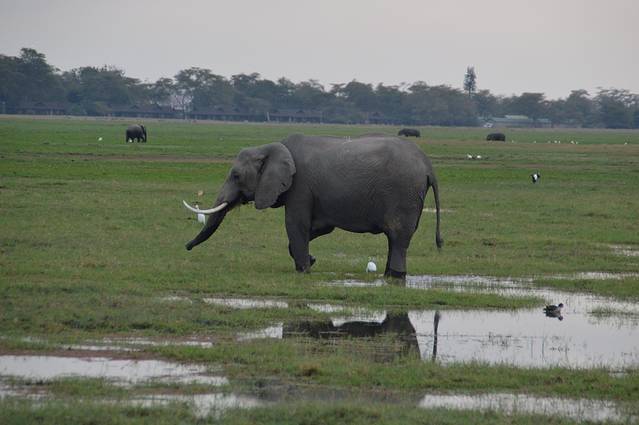 安博赛利的最后一站,还是看大象。大象和小象好像“亲吻”。他们伸出自己的鼻子互相缠绕,或许这就是吻了吧?更令人叫绝的是,这对母子旁边亦步亦趋地跟着一只的白色鸟,寸步不离大象。偶尔,会有一只小鸟扑腾扑腾翅膀,飞到大象的后背上,然后就默默地站着。大象也毫不在意,依旧悠闲地走着,据说这种鸟与大象是相辅相生的关系,它们依靠清理大象身上的东西生存,但也无意中帮助大象清理了皮肤里的细菌,因为大象皮皱褶太多了,所以只有这种鸟能用嘴给它清理出来。