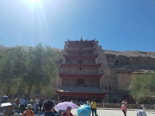 D7(8月9日),敦煌博物馆,敦煌莫高窟游览,《又见敦煌》情景剧,继续住大漠驿站。提前一个月预订了莫高窟12点半的门票,在旺季一定要提前预订,可以自己上敦煌研究院的官网预订,不然只能买应急票,应急票游览的窟比普通票要少很多。不赶时间,很晚才吃的早餐,早餐后到敦煌博物馆转了一圈,免费。敦煌博物馆值得一去,博物馆参观的线路设计的很有意思,在此可以了解莫高窟、了解敦煌、了解河西走廊……博物馆出来后提前半个小时到莫高窟数字中心取票,看宣传片,看三维环球影幕。第一个宣传片介绍莫高窟的历史,个人感觉一般,不如看央视纪录片《河西走廊》。第二个三维环球影幕主要介绍具体的石窟,没见过如此形式的影幕,感觉可以,挺大气,也比较新颖。看完两个介绍影片后,坐景区的摆渡大巴前往景区。固定人数一组,每人配一个固定频率的耳机,在解说员MM的带领下参观了12个窟,据说是很幸运的。站在窟里,感叹于时光的飞逝,感叹于古人的智慧,感叹于艺术的不朽。因为莫高窟,知道了敦煌学、乐尊和尚、王道士、常书鸿等等。几个小时的参观很累,因为有解说员MM的精彩解说而没有那么犯困,两个小孩竟然也坚持了下来,并且反馈还不错。参观完后坐摆渡车回数字中心,差不多五点的样子,开车前往顺张驴肉黄面馆吃“午饭”,饭后回到数字中心旁边的剧场看《又见敦煌》的表演。《又见敦煌》表演形式挺有意思,有1个多小时的移步换景,需要观众跟着场景走。最后有1小时左右是坐在剧场里看。个人感觉场面宏大、科技感十足,但情节比较混乱,主题太发散。如果没看过这种剧的,还是可以去体验一下吧。看完表演,回住处吃晚饭。
