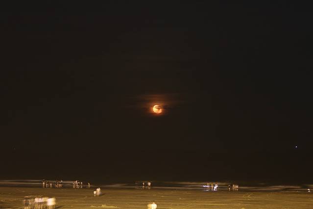 人们都还沉浸在各自的气氛中,一轮红月慢慢从海平面升起。不知是否赤月羞赧于露面,躲在厚厚的云后面,但这也不影响我们欣赏她。
