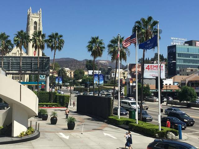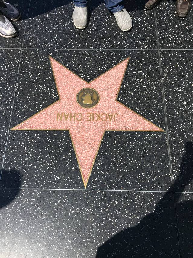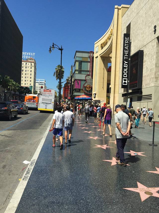 好莱坞的星光大道与香港的不同,不是在海边,而是在内陆的街道两旁。行走的路上留下了众多获得“奥斯卡金像奖”演员、导演和很出名艺人的名字。街道的两旁看起来有些普通和暗淡,但也看到了几个中国人名字,包括李小龙、成龙、冯小刚等电影人在内。