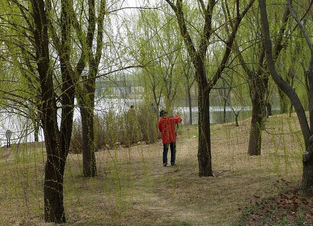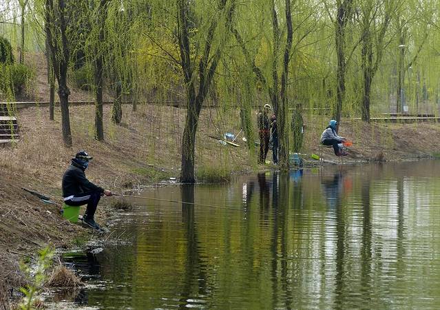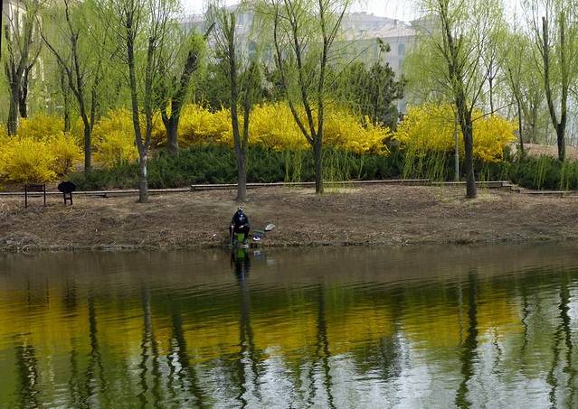 垂柳、迎春花和钓鱼人的倒影,映照在天鹅湖公园碧波中,像一幅油画。