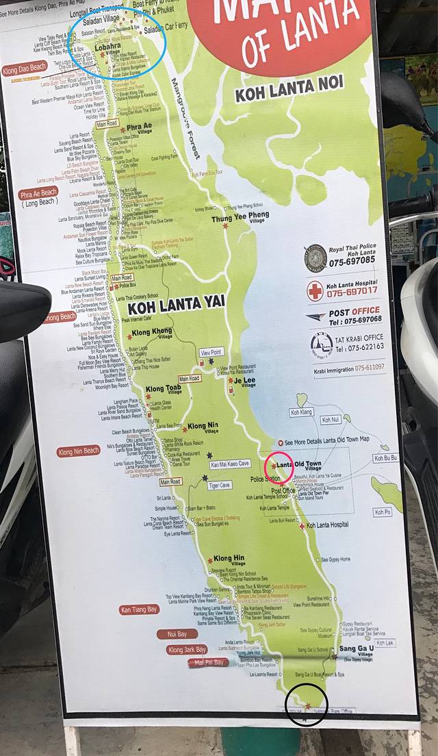 蓝色的圈就是兰塔岛北部最热闹的萨拉丹,我们酒店也在这附近。往最南端是国家公园,要往西边的路走才能到达,越往南景色越美。往西边的路一直到红色那圈是兰塔老镇,具有当地特色。往东边的路一直走到尽头就是国家公园(黑色圈),门票200B每人,景色很美。国家公园就是兰塔岛最南端,不能从这里通到西边的路。