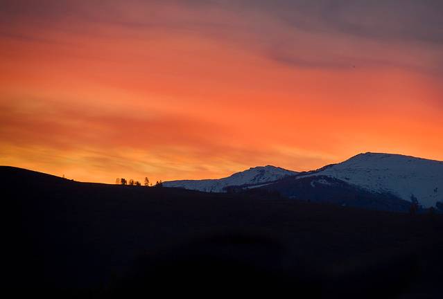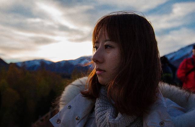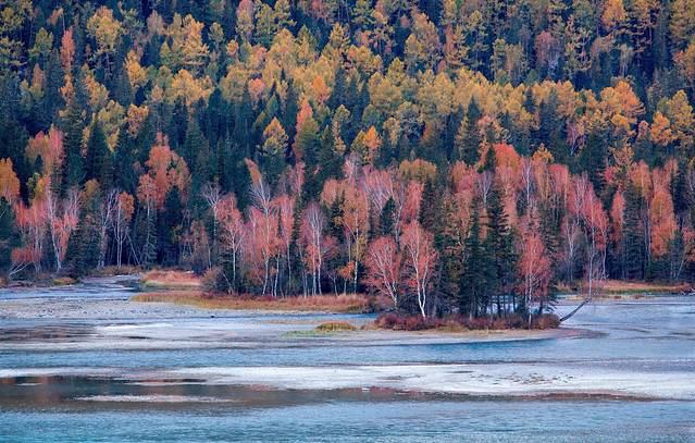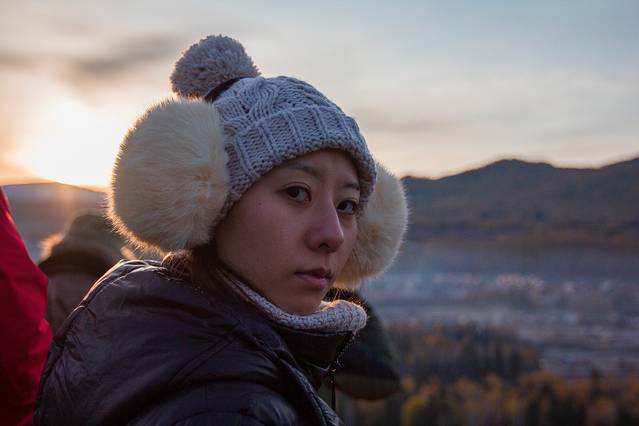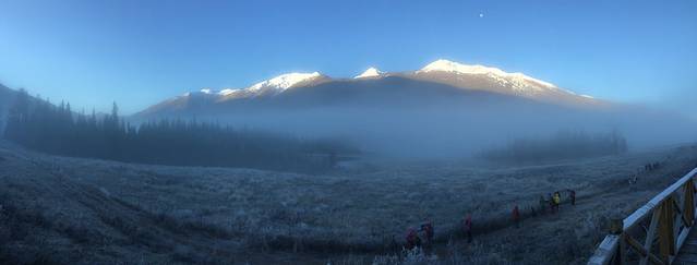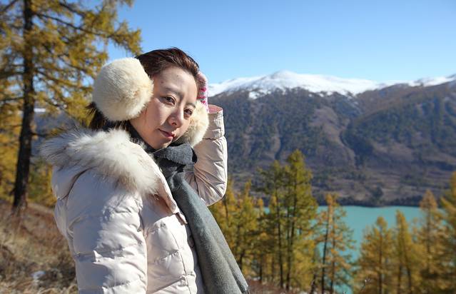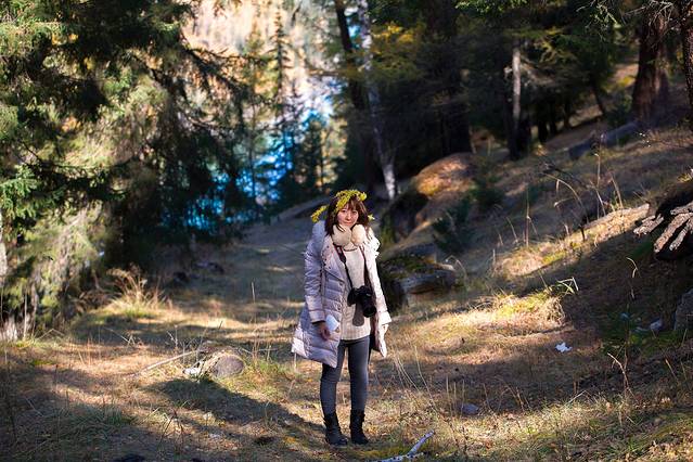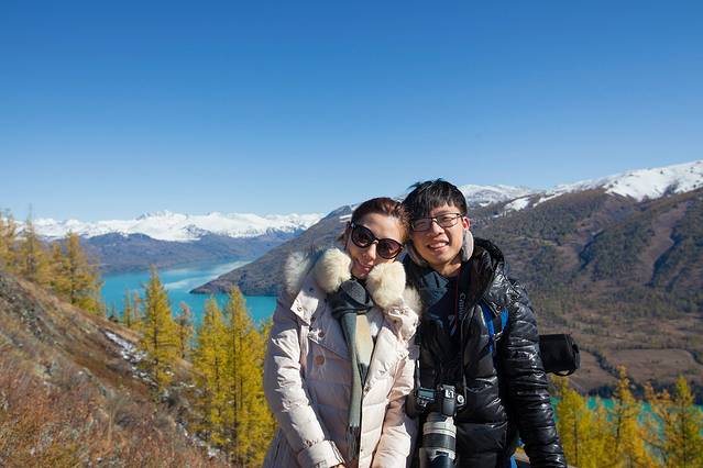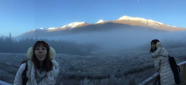 一大早老板娘就叫醒我们带我们去看神仙湾晨雾,每人50元。是昨天晚上谈好的价格,七点不到就出发了,就如平时凌晨4点多出门,天全是黑的,去到神仙湾时已经有十来个脚架驾好了,我走了一圈发现那个位置是不错,也架起了脚架。那时天好冷呀,肯定在零度以下,手指放外面一下就僵了。可怜了陪着我守晨雾的J妞,脚上套了两层袜子可还是觉得冷,懂得痛。七点到9点,晨雾今天并没有起床。拍了个日月同辉赶紧带J妞回去暖暖了。于是两人怒睡到12点多。全身都睡暖了,赶紧又有力气动了,所以在喀纳斯那边切记防寒!!
