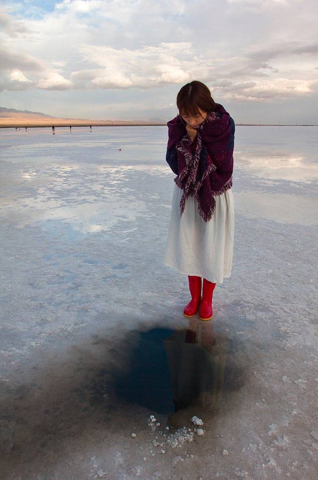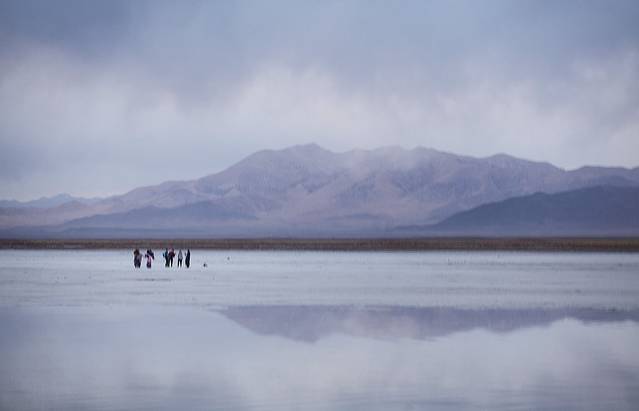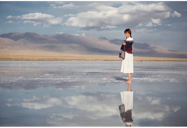 4点不到的样子到了黑马河,黑马河离茶卡还有80km,又一个小时终于到了有国产天空之境的地方,门票50一个人~ 里面下到盐湖里面的话可以在边上租雨靴,一般开十元,可以讲价到5元一对!再低我就不清楚了。如果想拍好点的照片,一定要往湖里走啊!里面的盐结晶比较刺脚,所以雨靴还是很有用的。茶卡盐湖并不大,从停车场慢慢走到最里面估计要用个十几二十分钟吧。