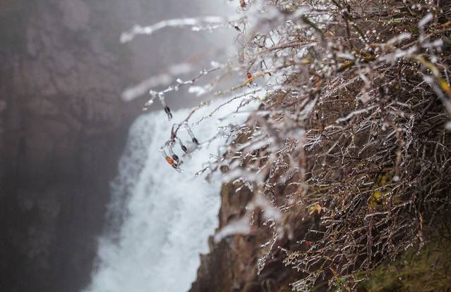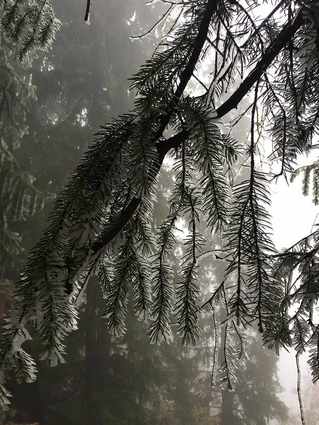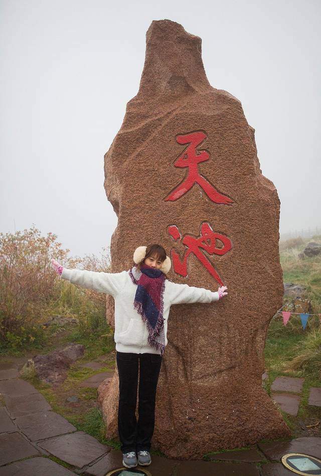 路上不会太久,小车一个小时出头就到了。那天刚好降温,出门时已经把秋裤都穿上了,结果下车还是觉得冷,接驳车往山上的路上下起了小雪,到了接驳车下车的地方沿着路走十分钟就可以到天池那个石碑那里了。很多植物上面都是冰。
