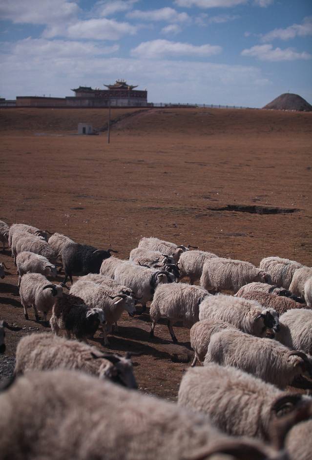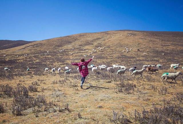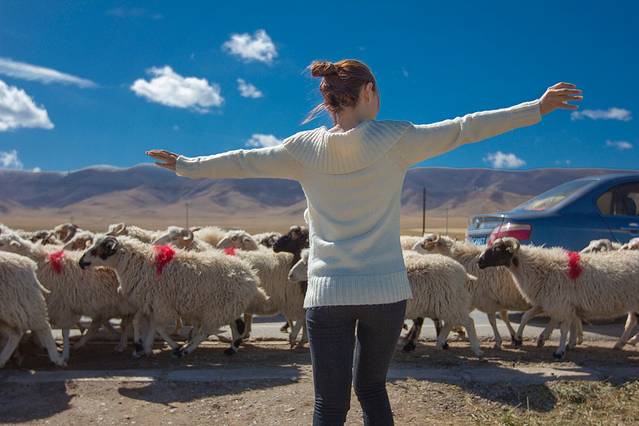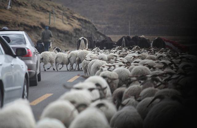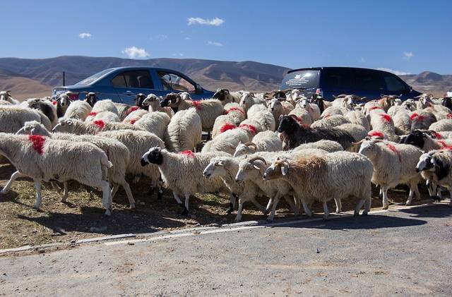 路上总会时不时慢下来,都是因为羊群和牦牛在过马路,然后车就给羊包围着走,时不时可以把手伸出去摸摸羊屁股~