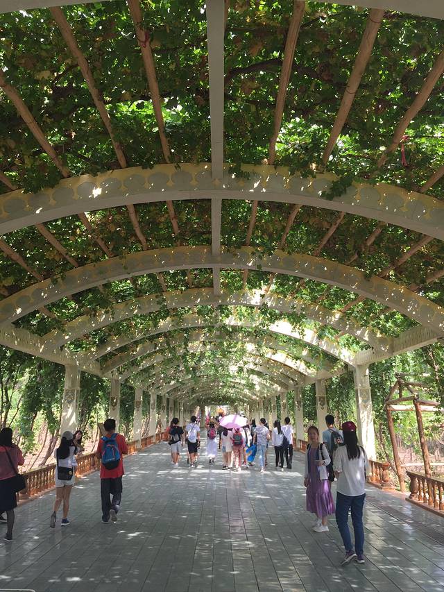 “吐鲁番的葡萄熟了”,我们来到了葡萄沟,徜徉在葡萄长廊下。只是头顶上的葡萄不让摘,否则每颗两百元,太贵,没人敢吃——哪怕同行中有土豪朋友,这就是“规则”,我们只能让导游在别的农家订购。之后游览“火焰山”,参观“苏公塔”,而最让我激动的地方却是“交河故城”。这是目前世界上最大、最古老、保存最完好的生土古城,曾经是古丝绸之路上最繁华的城市之一,有两千多年的历史。因为是丝绸之路的必经咽喉,自古就是兵家的必争之地。历经战火,并于1383年在战火中消亡。站在这座废墟的最高点,你看到的不仅是这个城奇妙的建筑风格,防御性的战略布局以及指挥系统、作战系统,还有四通八达的地下通道,堪称是通讯系统。曾被困十八年而未破。你还能闻到战争的气息、抗争的呐喊、团结的力量。这就是一艘古代的航母!