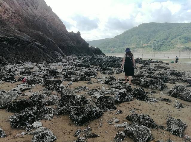 走下小山坡,下面都是长满淡菜的岩石,黑压压一片。