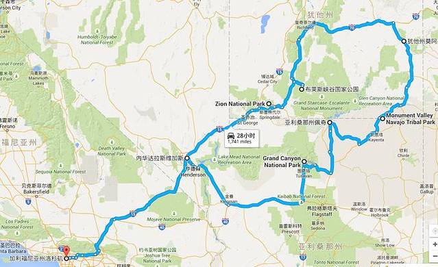 这里推荐个路线,在家的时候规划好的,回来后想想完全合理科学,除去最后需要长时间驾驶返回洛杉矶之外,其他每天驾驶时长都控制在3小时左右,留有足够的休息和游览时间。只是我这拍照的人,一走起来就时间全完全错乱,没能完全按这个路线行走,留给大家参考。