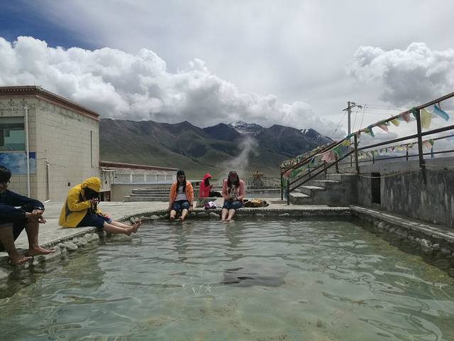 这是我泡过温度最高的温泉了,都下不去脚,蓝天白云下三五成群泡泡脚也别有一番滋味。