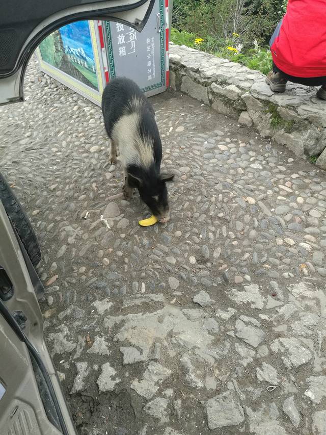 返程的时候路边有一只猪,新疆大姐准备喂一些零食,师傅说猪吃香蕉皮,吃的欢啊