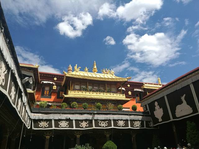 中午逛了大昭寺(门票85元),因为担心看不懂,请了个寺内的导游听讲解(40元每人,每次带5个人)。大昭寺最初由松赞干布建造,已有1300多年的历史,在藏传佛教中拥有至高无上的地位,一般被认为是拉萨的中心,里边供奉有释迦摩尼佛12岁等身佛像。导游告诉了这个等身佛像的含义,当今世上,由释迦牟尼佛亲自塑建、开光、加持的佛像仅存三尊,即8岁、12岁、25岁等身像,8岁的在小昭寺,25岁的在印度。其中,以12岁释迦牟尼的鎏金铜像最为精美与尊贵。我问为什么看到的12岁等身佛像会那么大,导游说是由于信徒会供奉刷金粉,一层一层的金粉刷上去,佛像会变大。最有印象的是导游告诉我们,我们最先接触的藏语并不是“扎西德勒”,而是“拉萨”这个词,就是佛地的意思。