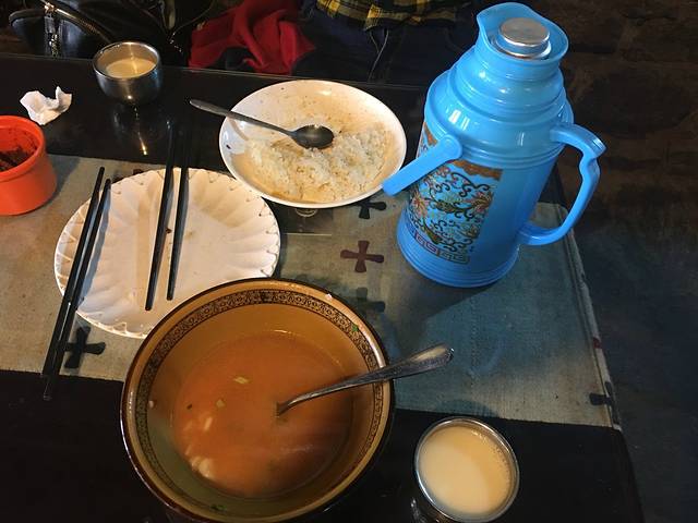 翻过海拔5200多的嘉措拉山口,开始走一段坑坑洼洼的土路,颠来颠去实在辛苦。到达定日县城就餐,这里不得不吐槽团餐的问题了,西藏随处可见川菜馆、重庆菜馆,但我们这个团在相隔几百公里的不同餐馆,吃的却几乎是一样的菜色,一样的味道餐食就让我差点崩溃了。师傅说你们可以随便选地方,回程我们换地方吃饭味道也没差。
