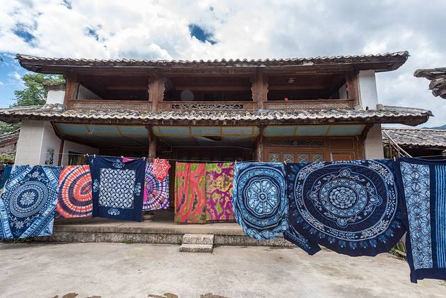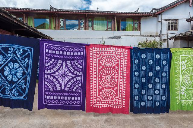 扎染和蜡染都是纳西族的手工艺,老街上许多院落里挂着五颜六色的花布,游客可以随意走进去欣赏,跟主人聊天,扎染也是技术活,在白布上用线扎出一个一个的图案,然后用植物染料染布,把线去掉后就是彩色图案了。