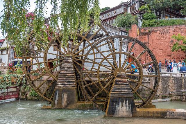 古城的另外一个标志就是北门的大水车了,许多游客都会在这里拍一张照片留念,如今的大水车已经失去了实用价值,就是一个人造的景观,沿着河一直往南走就是丽江有名的酒吧街。