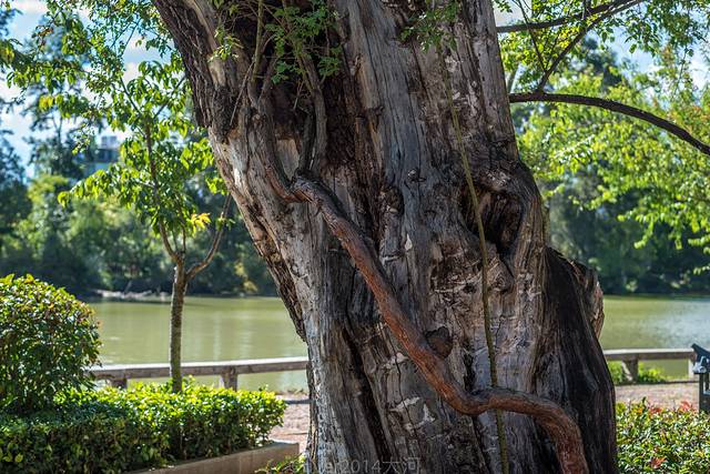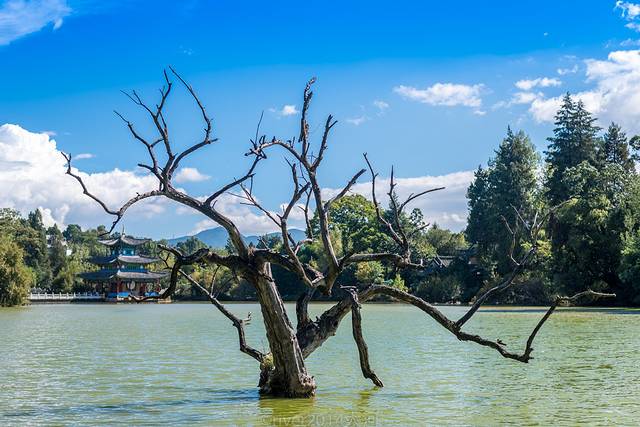 水中的枯树在大理的洱海边很常见,在丽江的黑龙潭公园里也有,只剩下遒劲的枝干舒展在水面上,显得有些沧桑。