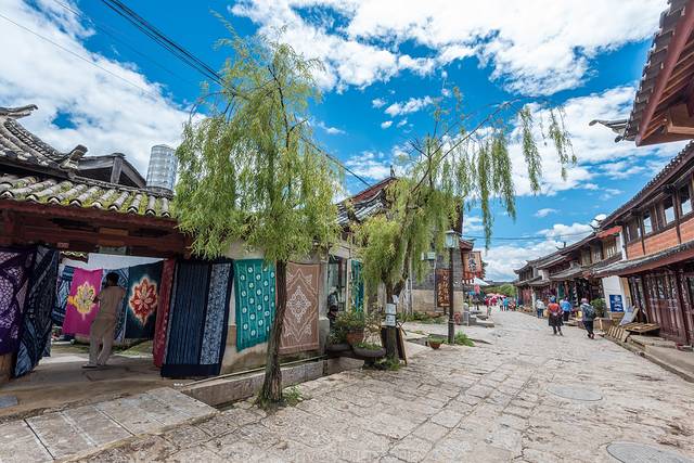 白沙古镇实际上就是一条老街,游人不多,保留着原汁原味的纳西族风貌,街上许多老人,平时也穿着民族服饰,而家家门口的扎染更是纳西族的传统工艺。