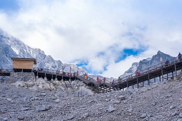 沿着山谷都有游人行走的木栈道和机动车道,从冰川公园的缆车处可以乘坐景区大巴直接到达蓝月谷,然后沿着木栈道前行观光。