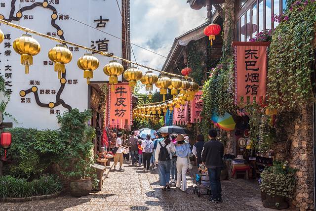 丽江作为茶马古道的一个重要节点,其兴盛繁荣与马帮有着密切联系。在景区里也有一条茶马古道,像是穿越回到了几百年前,这里的工作人员都身着古装,店铺也是古朴的样子。