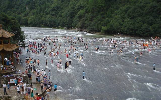 接着就是下一站白水洋景区了。从鸳鸯溪出来的时候天气是带点晴朗的,一路上开回白水洋又晴转阴了。抵达白水洋的时候大概是大中午了,进入景区,景区当中有餐厅,也有一些特色的小吃店等等,乘坐观光车前往白水洋水上广场。