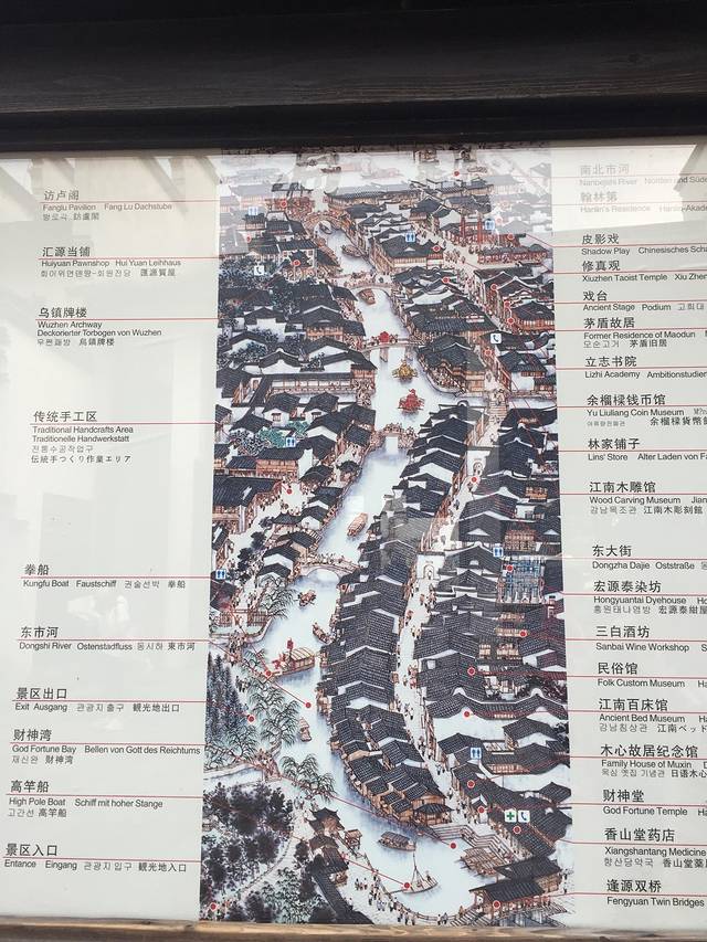 滴滴师傅是汽车发烧友,爱好改装,送我到乌镇东栅南门,停车场很大。我持国导证直接走的5号通道。入口一条竹林道,一条石道,景区示意图下(图一)刚好来了团队,可以蹭一下导游。团队中一小女孩很显眼,极漂亮、极其可爱,让人看了忍不住要抱抱她妈妈的那种……