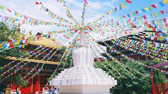 过了检票口就能看到一个白塔,代表了祈福,上面挂着经幡,很是漂亮,在蓝天的映衬下,让人的心情都是彩色额。白塔的左边是一个提供免费的民族服装场所,让游客能身临其境的感受茶马古道的魅力,只需要交押金,离开的时候就能退回,这样为游客着想的体验很是加分。