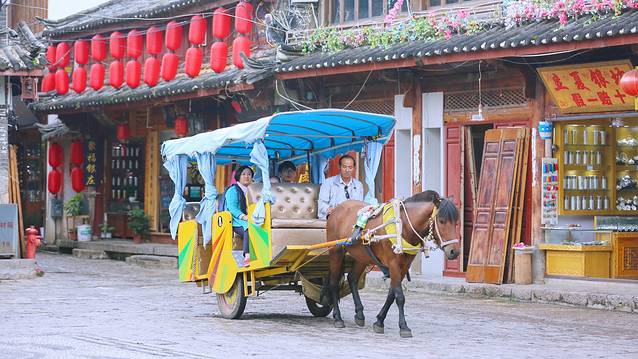 束河古镇里提供骑马和马车的服务,想要骑马漫游古镇也是不错的选择。然而我和我的小伙伴都受不了那个马的味道,一致觉得除了马味,束河就没啥缺点了。