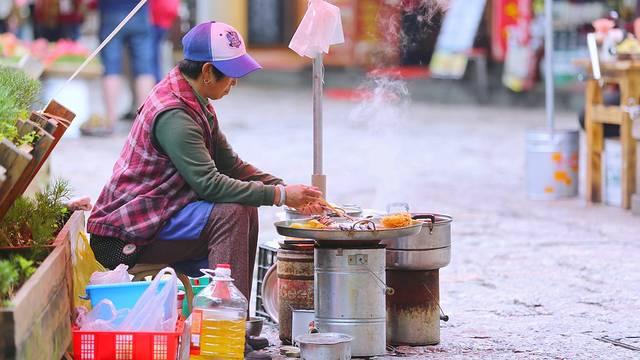街边卖小吃的阿姨,我很喜欢这些油炸的食物,特别是对土豆丝饼各种热爱。记得小时候吃过之后就各种想念,但是家里人也没有工具做,终于在束河找到了,虽然比小时候吃的厚,但是味道还是一样的。