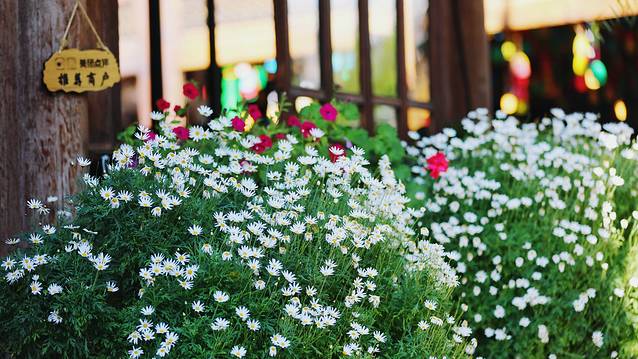 我很喜欢古镇的原因是,每个店家都会精心的打扮自己的店。那些在阳光下的花儿开的多好。