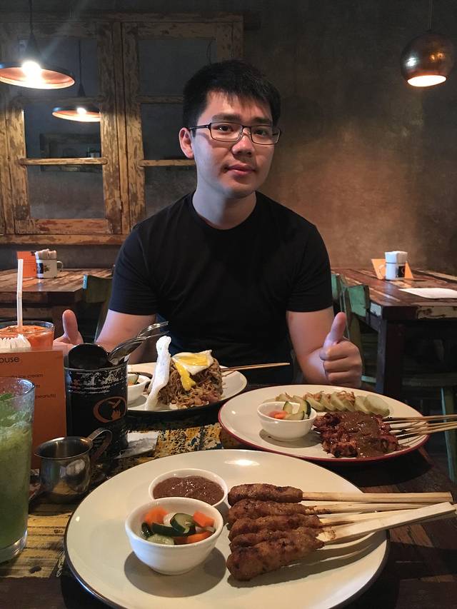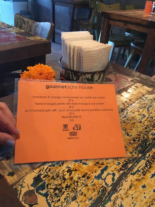 从宾馆到sate house很近,我们打车过来的。宾馆的小哥开玩笑跟我们说打车5分钟,你们跑过去也5分钟就到啦。sate house室内室外都有座位,我们看见个室外座位就坐下了。看了半天菜单感觉不对,怎么没有任何沙爹肉串类的东西。然后发现,那是隔壁的韩国餐厅。。。跟服务员把菜单还了回去,服务员就指了指隔壁店家,估计明白我们走错店了,我们也点点头会心一笑。看来我们绝不是第一个进错店的客人。