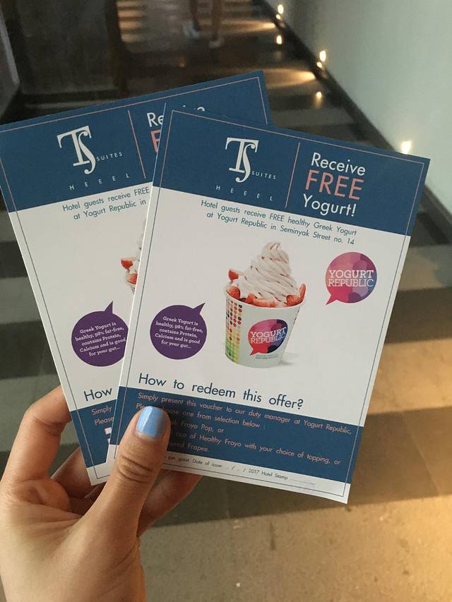 办理入住的时候,前台给了我们两张免费yogurt的券,离酒店不太远,但是由于后面两天身体不舒服,很遗憾没能去品尝。