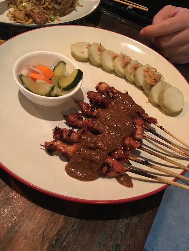 我们点了沙爹鸡肉串,沙爹鸭肉串,印尼炒面,薄荷荔枝沙冰,胡萝卜橙子青柠汁。这家我觉得是我在巴厘岛吃的最好吃的沙嗲啦,花生