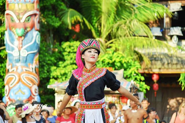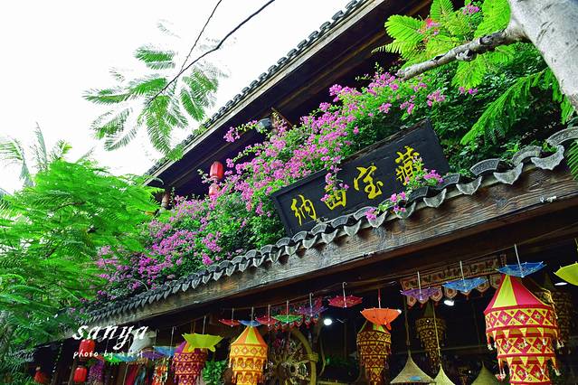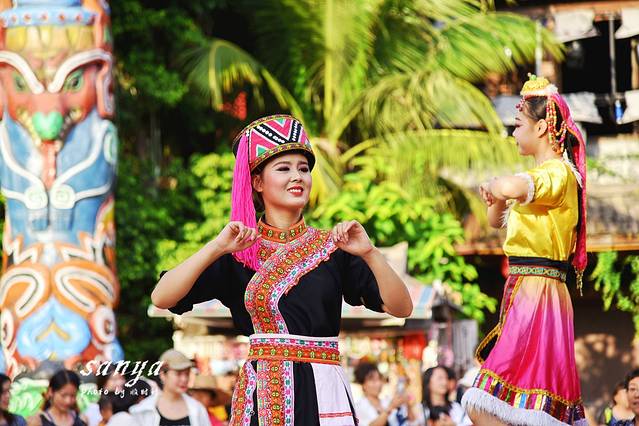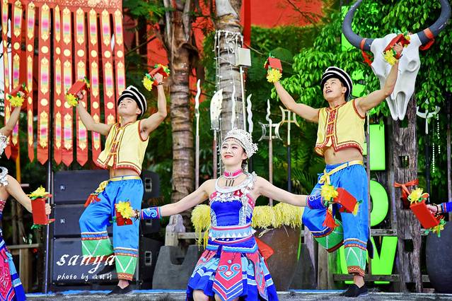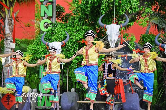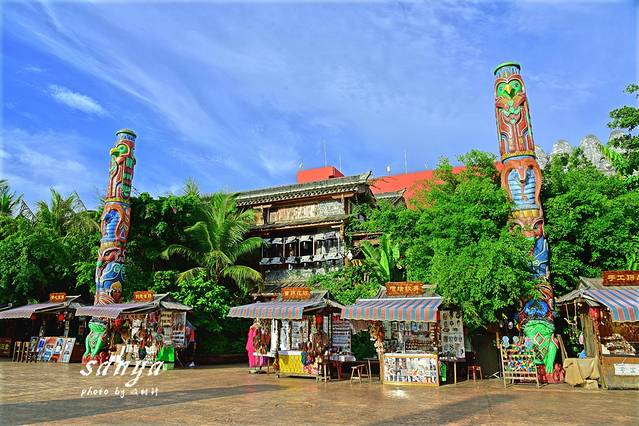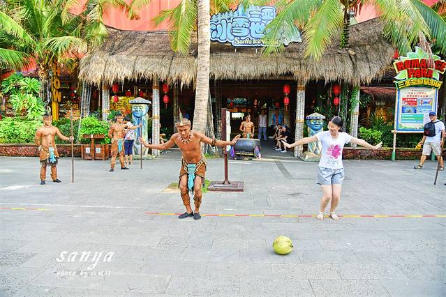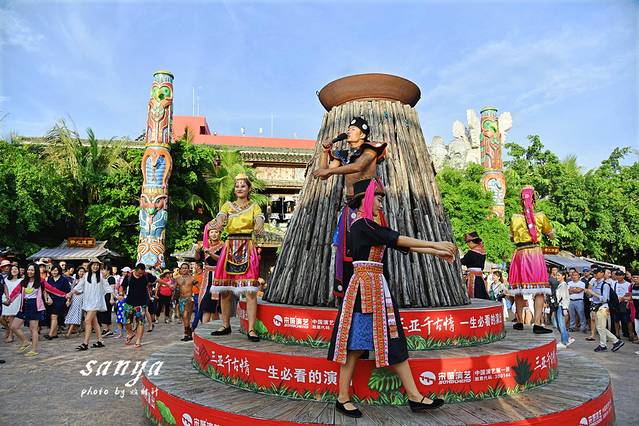 逛了两个主题公园决定在千古情景区好好转转了,因为此时很多表演正在上演,作为三亚宋城旅游区内的主打景区,整个景区掩映在茂密的原始森林和鲜花丛中,有千古情剧场、南海女神广场、图腾大道、崖州古城、爱情谷、科技游乐馆、黎村、苗寨、清明上河图、戏水区、小吃广场、宋城六间房广场、鬼域惊魂等数十个主题区。各个主题区除了建筑复古很具欣赏价值,同时整个景区每天都有二十余场外景演出,节目很丰富,也有很多帅哥美女,穿梭于景区犹如置身于古代的热闹街道,有点游走于现实与远古之间的感觉,演员身着古装还原各种古代市井生活的场景,景区沿路的杂技、舞蹈等表演更是让人称奇。随时有古代人从身边走过,随时就可以狂欢,突然间大音乐就想起,你会不由自主的和表演者和游客们一起嗨起来狂欢,你可以如穿越一般穿行在千古情景区各个角落与演员互动,也可以参与到表演中,景区的表演者很会带动节奏的哦,即使是一个人独自旅行你也不会有任何孤独感。