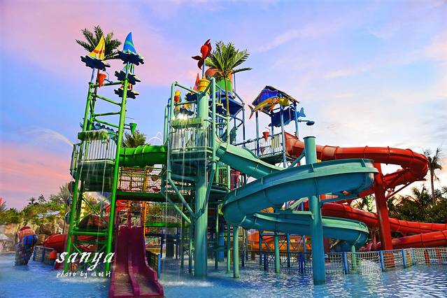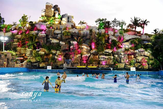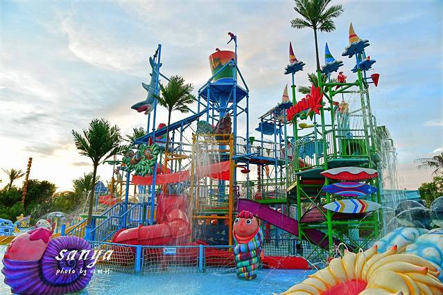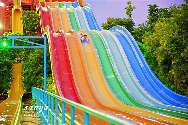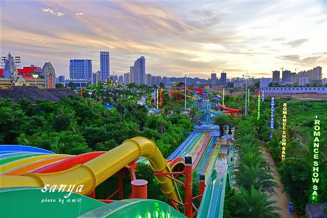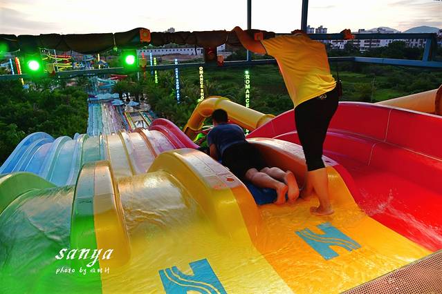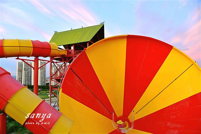 等到太阳渐渐西下后我们去了宋城浪浪浪水公园感受水上运动的刺激和畅快。玩水的主题公园我们玩得比较多,但是在四季如夏的三亚,任何时候去三亚宋城浪浪浪水公园都很适合。这里是尤其适合带小孩游玩,比起汹涌的大海,这里的水质更好玩得也更安全。景区水质监测牌每天都播报着水公园的水质情况。水公园除了存包需要租用寄存柜(20元不限时也算够便宜的了),景区的救生衣、淡水冲凉都是免费提供真心很赞。水公园内有浪迹天涯、三亚号角、山涧穿越、鸳鸯滑道、丛林漂流、欢乐水寨、弄潮儿等数十项大型水上游乐设备,从小孩到老人都能找到适合自己玩的游乐项目,任何项目都包含在门票内,可免费多次畅玩。我觉得最刺激的当属穿越时空大喇叭和彩虹滑道,从高空俯冲而下又高速滑行,水花四溅又紧张刺激。不过穿越时空大喇叭必须要满4人才能玩哦,我们去的时候是工作时间,还在戏水区找了2个人凑在一起玩的。觉得这个时候去水公园是好明智的选择,因为水公园里很多设备足有3、4层楼高,傍晚在词还看到了壮观的落日和火烧云。