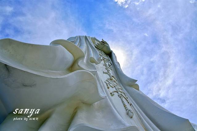 今天的行程重点是三亚南山文化旅游区,就是108米海上观音所在地,你在飞机上快降落三亚时就能看到那壮观的南海观音。距离三亚市区有40多公里,坐公交车至少一个多小时,到南山的公交车记住是在南山寺站下车,下车后要走很长一段路才到景区入口,不要听信的士司机说可以给你送到门口,任何车都进不去的。南山文化旅游区是一座展示中国佛教传统文化的大型园区。主要景点有南山寺、南海观音佛像、不二法门、观音文化苑、天竺圣迹、佛名胜景观苑、十方塔林与归根园、佛教文化交流中心、素斋购物一条街等。不过这些景点在108 米海上观音上都显得那么苍白无力。海上观音所在的南山佛教文化苑别名鳌山,是祖国最南的山,山高500余米,山上终年祥云缭绕,气象万千。加上去的时候天气特别给力,蓝天白云,拍出来的观音真的如同在仙界一般的美。