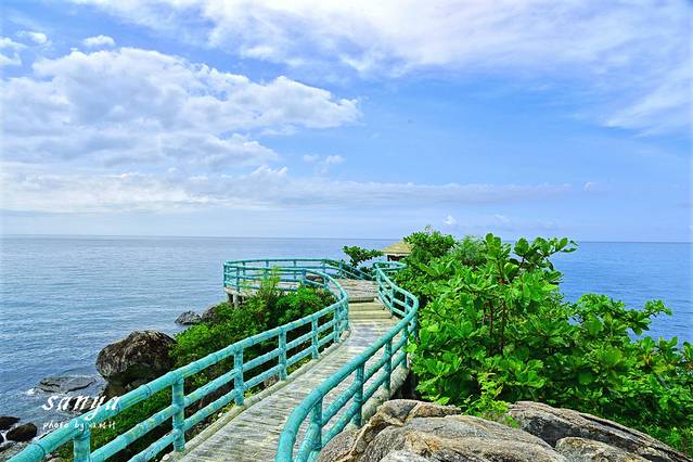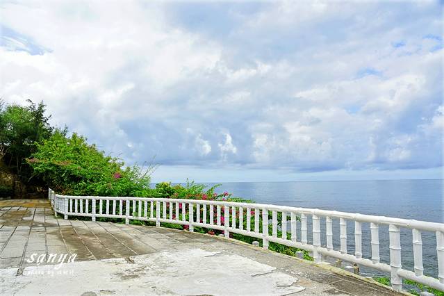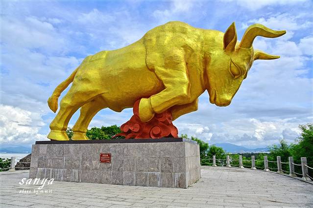 今天出发的较早,到了西岛后才上午8点多,去时天气不算好,乌云密布,此时海底能见度低,不适宜潜水,果断乘坐电瓶车转入牛王岭。牛王岭是与西岛几近相连的袖珍小岛,一定要坐观光车过去,至少10分钟车程,自行车是不能骑行过去的,乘电瓶车经环岛西路和一条长长的海上栈道便可抵达。这里拥有最原始的海岛风光,可以欣赏到壮阔的海天一色、鬼斧神工的礁石景观以及星罗棋布的军事遗迹。牛王岭是西岛的最高处,登此岭可观望四周,视野非常好,.海边有不少礁石,是来听潮水拍岸声音的好地方。牛王岭上建有曲桥回廊,亭台石雕,岭顶有一雄伟雕塑叫金牛望海,登上去一点不费力,可以一览这片海域的全景。
