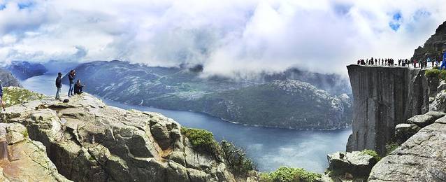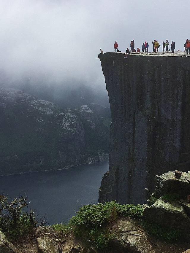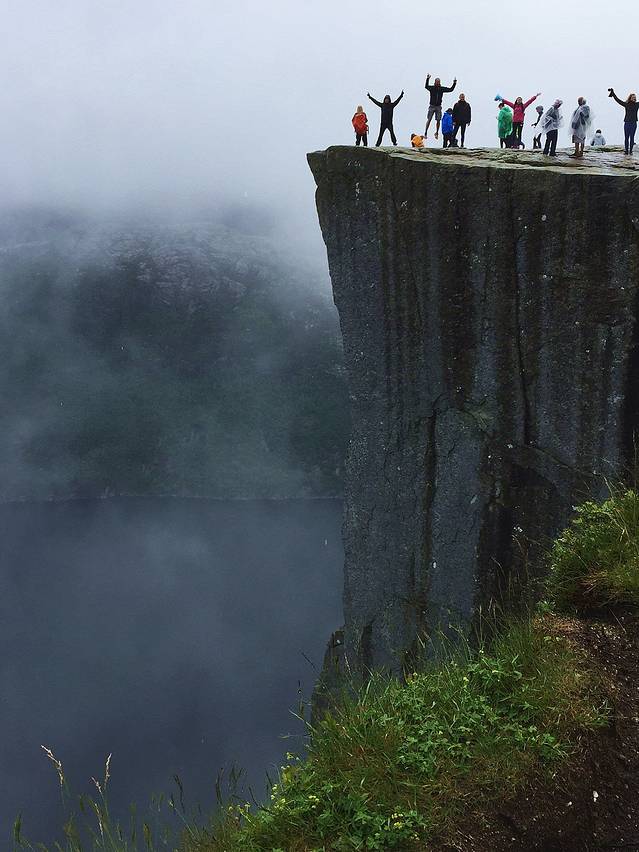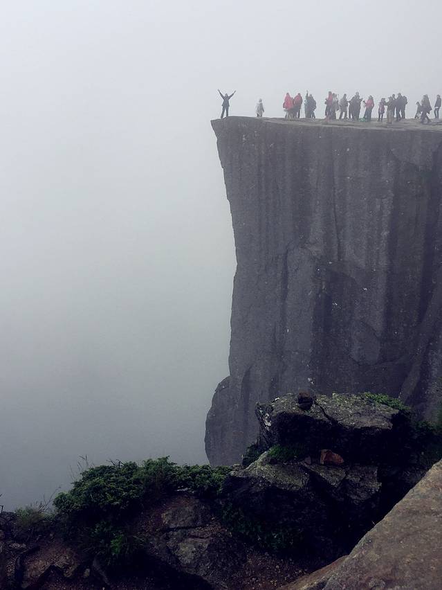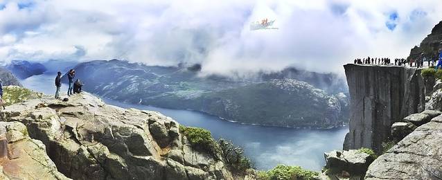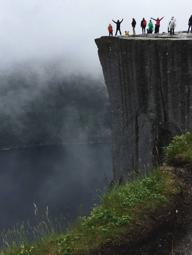 大雾消散,刀削般的布道石清晰地竖立在眼前,下面的吕瑟峡湾,远处山恋全部清新地出现了,非常兴奋。人们用各种姿式,各种形态来表达惊喜之情,表达对大自然的热爱和无私馈赠。