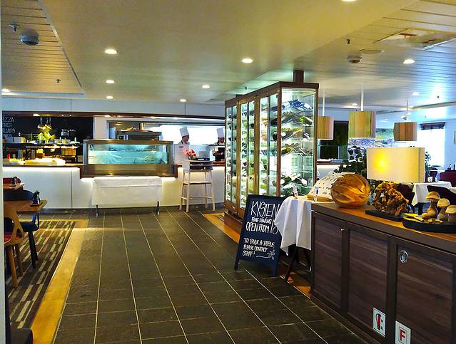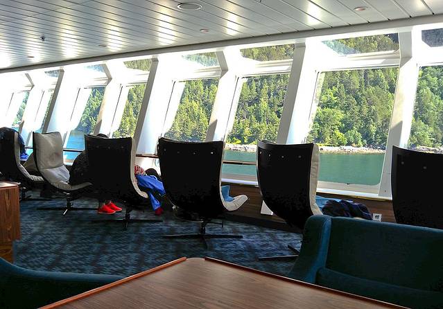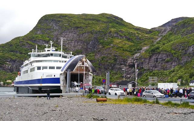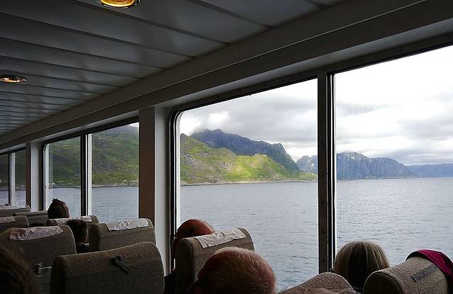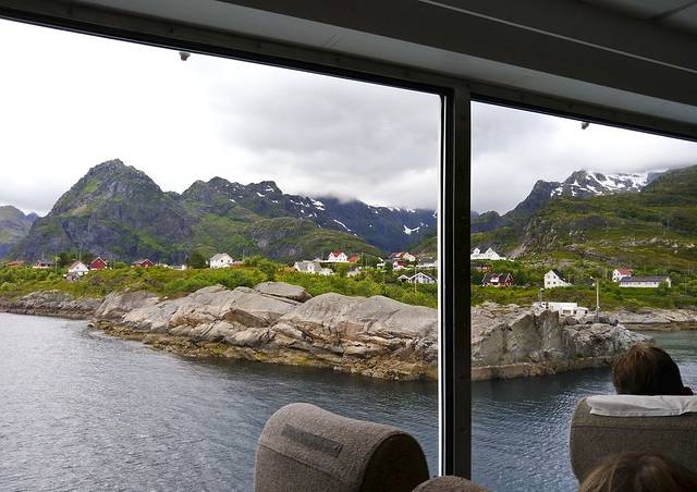 在码头买了点吃的填填肚子,10:30渡船来了,排队上船时买票,2个成人一个老人是424,也不知每人是多少。行李就让放在一层的行李架上,人上到二层,有许多休息的坐椅,还有小吃部供应些简单的热狗饮料。船上的人还不少,我们在船尾处找了长椅,这一路没什么景色,就又躺了会儿。下午2:00多到达Moskenes码头,去我们入住的Hamnoy村的公交742要2:30来,第一站是雷纳村,第二站就是Hamnoy,中间的COOP超市等也都有站,无人上下车就不停了。