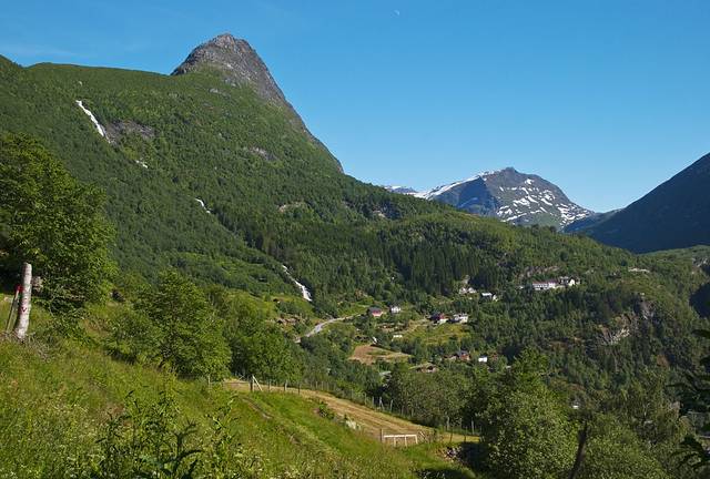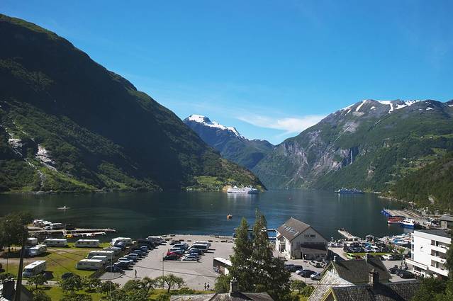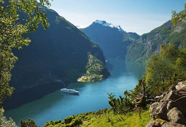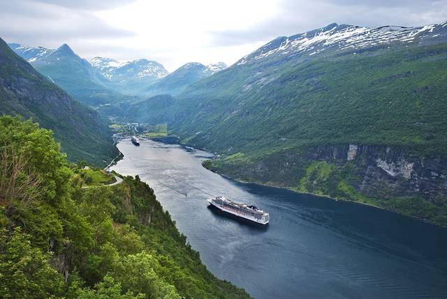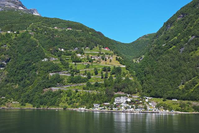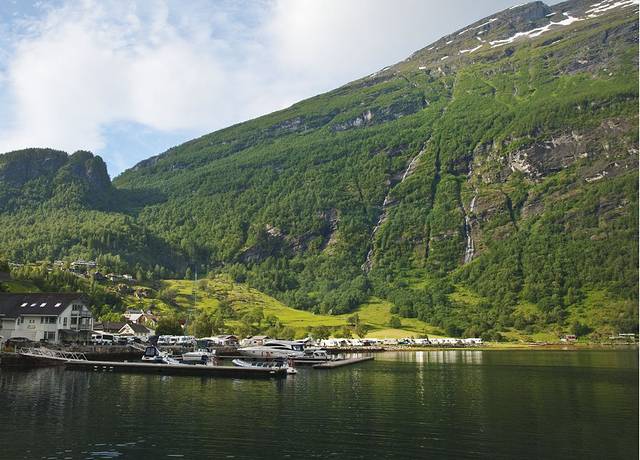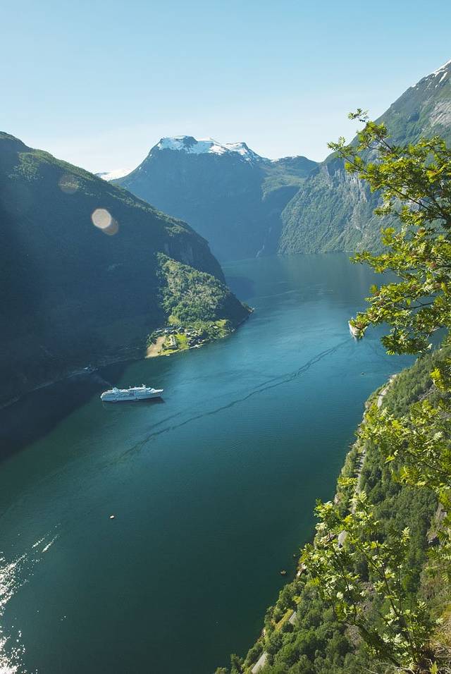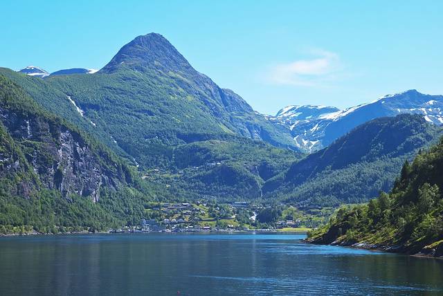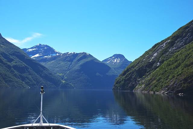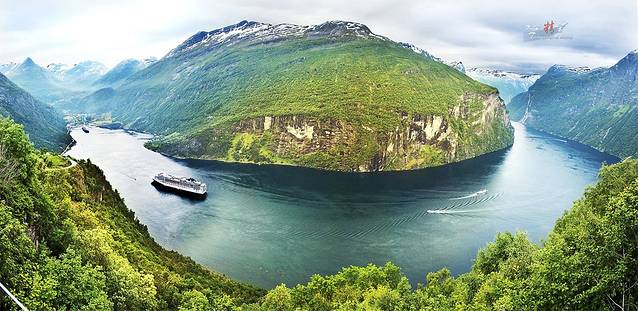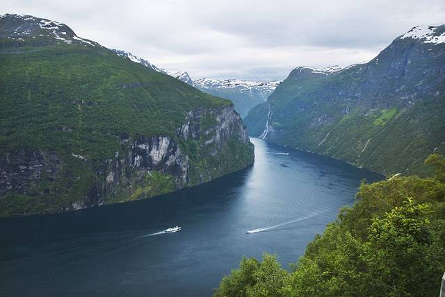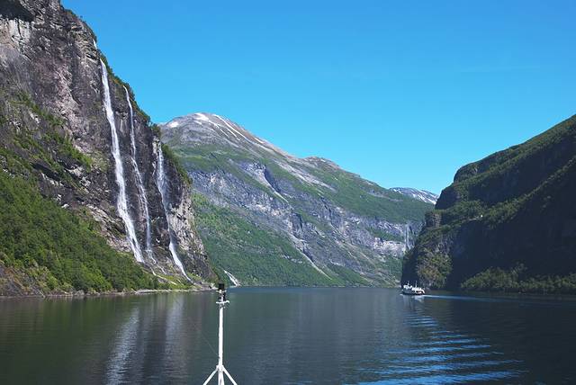 盖朗厄尔峡湾 是挪威最漂亮的峡湾,两岸耸立着陡峭嶙峋的崖壁,峡湾两侧有多条瀑布,都是从上方雪山森林飞流汇入大海,晴朗的阳光让眼前的景色美不胜收。