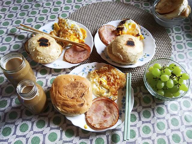 早上起来还是阴天。煎蛋、火腿、面包 等,吃完又带上,还有几个桃子。