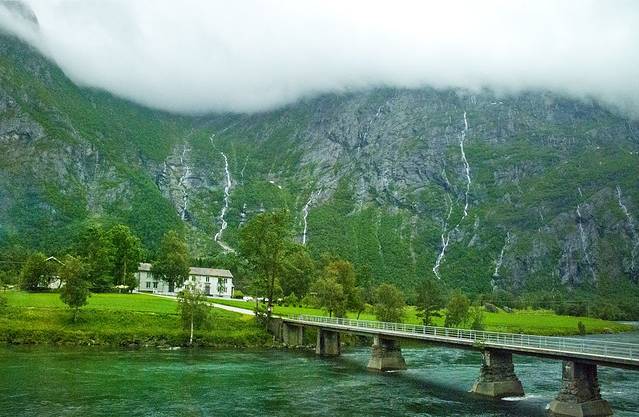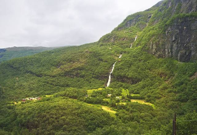 一小时时间很快过去,从这里乘坐到达Dombas的是只有两节车厢的景观列车, 行走时发现坐在行车右侧更好些,一路景致很棒,瀑布雪山,草坪河流,只是阴天。