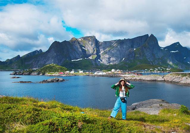 进村的大桥上是欣赏拍摄雷纳村最好的机位,前景的花、湖,红色木屋,还有远处的尖峰,组合了一幅经典的罗弗敦群岛画面。只是今天阳光不行,偶尔露出来也是弱弱的。