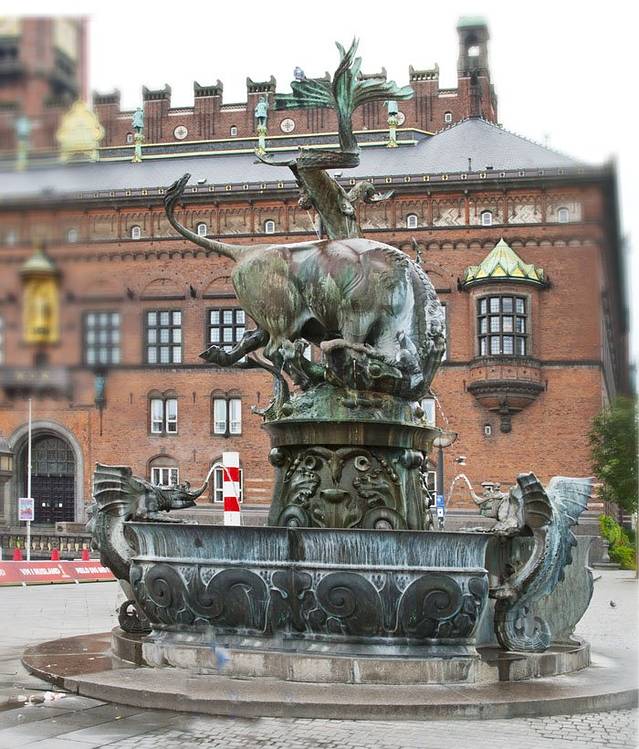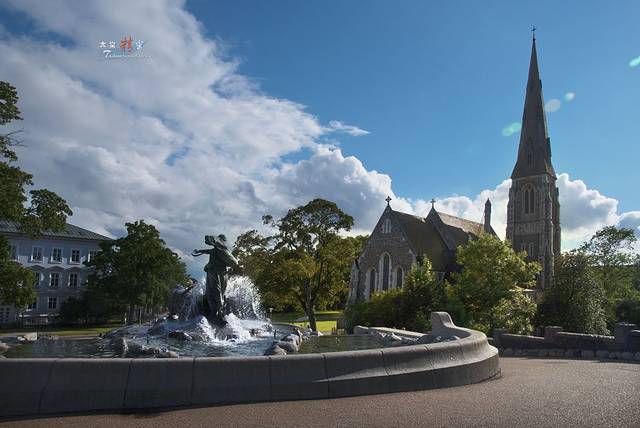 哥本哈根吉菲昂喷泉和阿尔班教堂。 小教堂造型经典, 古老的喷泉在阳光下溅起耀眼的水花,飞舞着让人着迷。