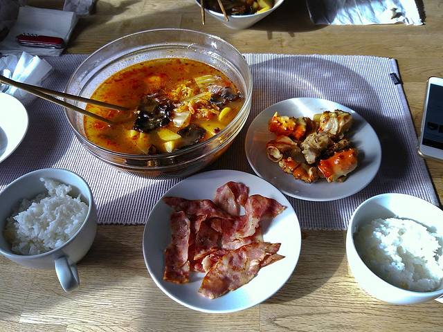 醒了做晚饭,暴炒帝王蟹、四川火锅、米饭,非常美味的一顿大餐。