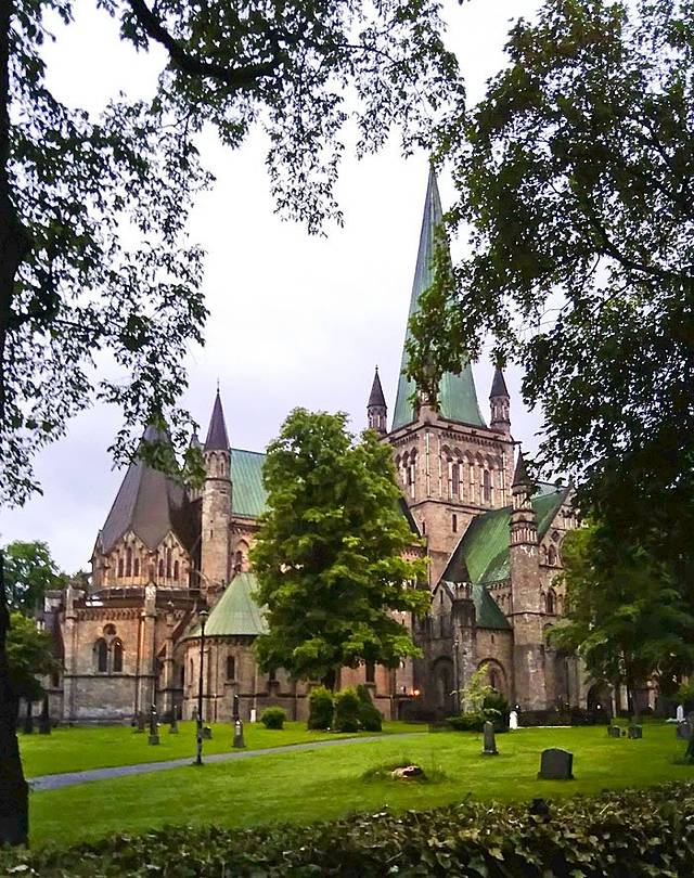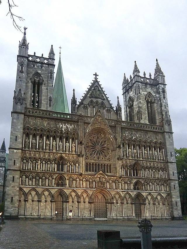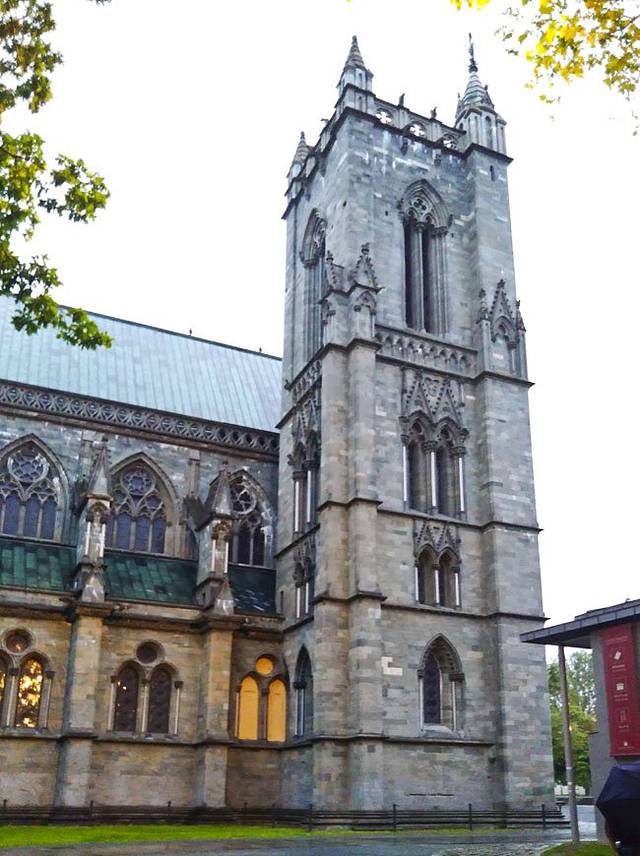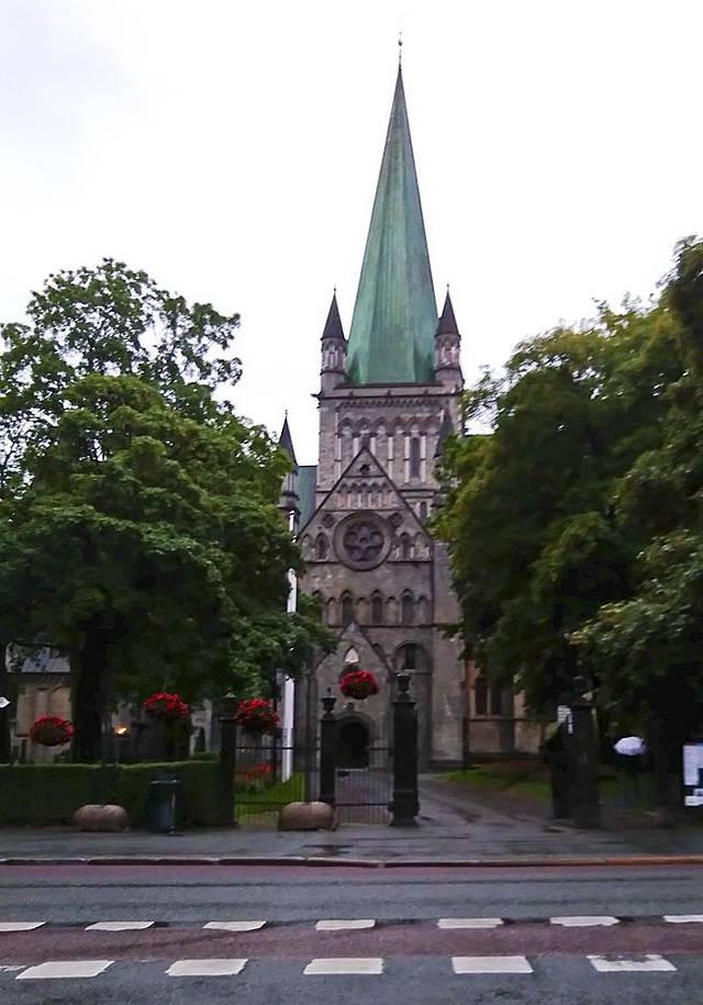 好在已进入北极圈,天空是不黑的。快步出发,向火车站对面一直走约10分钟就是尼德罗斯大教堂, 是斯堪地纳维亚半岛最为壮观的教堂,建于奥拉夫二世的陵墓之上,于12、13世纪间建成。800年来大教堂历经兵灾火劫,1869年开始重建,最后一次重建是在1869年,前后共花了100多年的时间,用挪威的篮肥皂石和白大理石建造而成,装潢繁复,精雕细镂,被认为是挪威最宏伟的哥特式大教堂,历代国王都在此举行加冕礼。