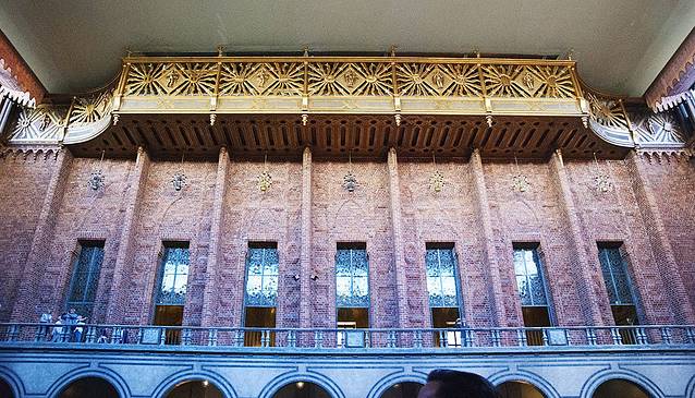 首先从蓝厅开始,这是举行诺贝尔晚宴地方,美媚说楼梯的宽度和高度都是设计师根据女人的步伐和裙子精心做出的最佳设计。摄影师都在二层第二、三个窗子里面拍摄,那个星形标记是让获奖者走下楼梯时眼睛注示的最佳角度。