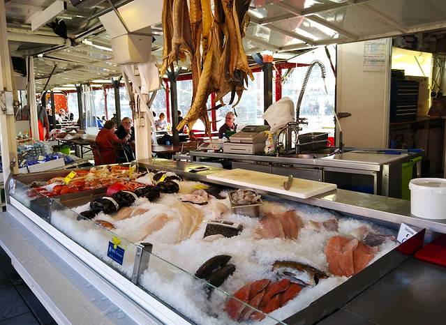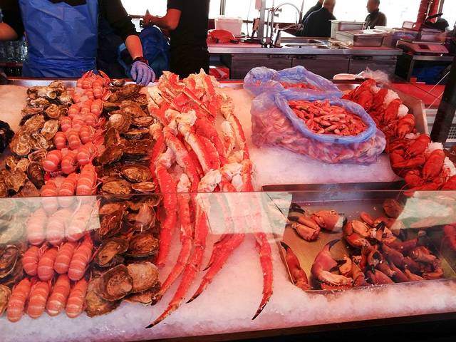 不着急了边走边玩儿边拍照,一会儿到了鱼市还开着门营业,又买了一条帝王蟹腿,半条黑雪鱼。帝王蟹500一公斤,比卑尔根鱼市便宜近一半,黑雪鱼90多,白雪鱼156一公斤。这里出售的海鲜都是当天新打上来的。
