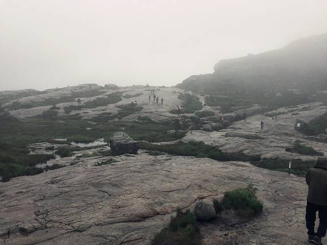 虽然今天天儿不好,但不断有人上山,根本不用担心单独一人危险。我们试着爬了一点,难度真的非常大,布道石无法与这里相比,那里不管怎样是有路的,这里就是一座陡峭的山壁,经常是大石板当道,我们好不容易爬上一块大石板,坐下来休息,一对老外夫妇下山不爬了。一个年青家庭,刚一上山女孩就抻了腰,全家陪她一块下来了。还有一家深圳夫妻,带个6岁男孩,见我们有老人也劝我们别上了。再三犹豫,加上风大没太阳,还是下去吧。晚上回来时发现这家深圳人就住在我们旁边,他们说越往上越难,幸好你们下去了,儿子几乎就是滚下去的,现在腿疼,而且山上风好大,只呆了5分钟就下去了,不过风景是非常好。旅行就是这样,量力而行才最明智。