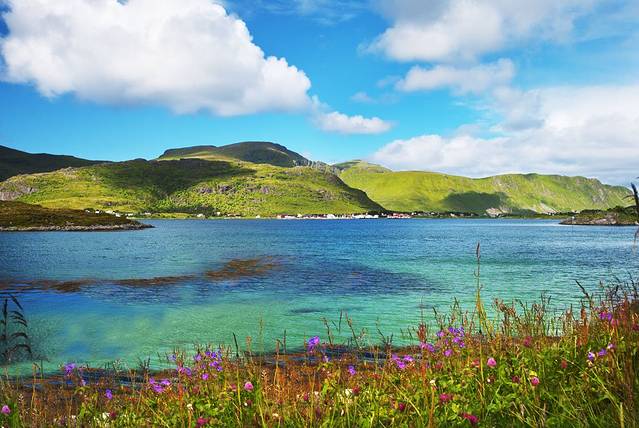 第二个桥低一些,过桥再走一点是个休息区,有几个凉亭,里面有桌椅,还有洗手间,很不错的地方。在这时我们休息了一下,看了看地图,从这里再走一点也有个小沙滩。许多人来罗弗敦群岛,都将Fredvang村下一站的白沙滩作为一个景点,但我认为北极圈内的沙滩怎能与赤道上的热带沙滩芘美,便放弃了。但现在比起来沙滩还是比村子更吸引我们。 通向村中的路走一点有个叉口,向左是Fredvang村,向右是海边。我们向右走去,哇!这又是一片极美之地,大片大片的草地上开满各色鲜花,一栋栋白色小屋点缀在其中,这里是仙女的家吗?