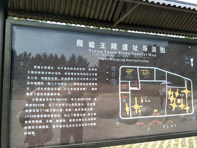 殷墟是中国商代后期都城遗址,是中国历史上被证实的第一个都城,位于中国河南安阳市殷都区小屯村周围,它的发现和发掘被评为20世纪中国“100项重大考古发现”之首。 殷墟王陵遗址与殷墟宫殿宗庙遗址、洹北商城遗址等共同组成了规模宏大、气势恢宏的殷墟遗址,大致分为宫殿区、王陵区、一般墓葬区、手工业作坊区、平民居住区和奴隶居住区。 殷墟总面积达24平方公里,内有大量的青铜器,石器,骨器,玉器等具有珍贵史料价值的文物,其中最有名的是重达 875公斤的“司母戊大方鼎”,它是迄今世界上所发现的最大最重的青铜器。 殷墟宫殿区驰名中外,为世界文明古国中最著名的“古典城邦”之一。50余座建筑遗址分“宫殿、宗庙、祭坛(甲、乙、丙)”三组,宏伟壮观。另外还发现铸铜遗址等。宫殿区出土大量的甲骨文、青铜器、玉器、宝石器等珍贵文物。殷墟文物有的是华夏之最,有的是世界之冠,蕴藏着殷代先民们的创造、智慧和卓越的技能。考古专家评价,殷墟“发掘着一个典型的奴隶社会”。具有“都市、文字和青铜器三个要素”。“是一个灿烂的中国文明”。著名历史学家郭沫若赋诗云:“洹水安阳名不虚,三千年前是帝都。”“中原文化殷创始”“观此胜于读古书”。王陵遗址共发现有12座王陵大墓和2500多座祭祀坑。